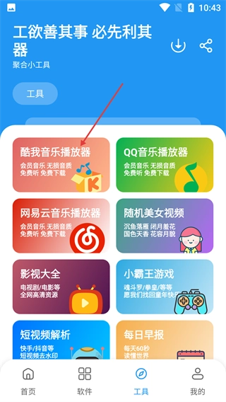 在工具页面,点击【酷我音乐播放器】即可使用该应用的会员音乐、无损音质等功能。