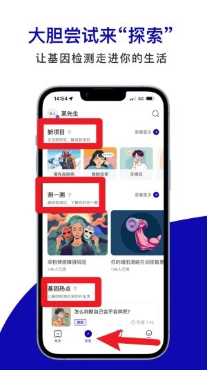 进入探索板块,用户可以查看新项目、参与测一测活动以及了解基因热点,从而以更具趣味性的方式探索各类基因研究主题。