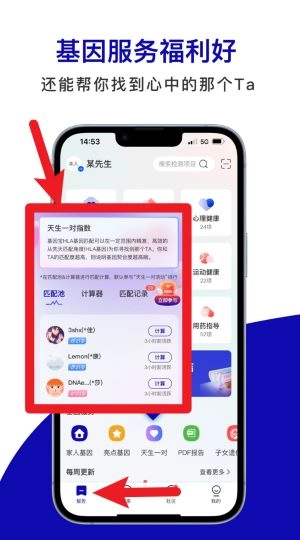 在天生一对模块里,借助基因匹配算法为你寻觅合适的另一半,点击计算就能查看双方的匹配指数以及推荐结果。