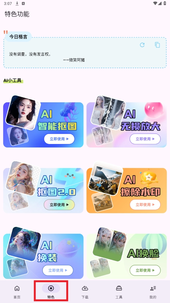 特色功能里包含了AI抠图、AI无损放大等丰富多样的修图功能,为用户带来了超多实用的修图选择。