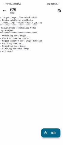 上面的图片呈现了刷入修补后的boot文件后显示的Magisk界面。安装Magisk应用程序是必须满足的前提条件。部分版本在完成安装操作后会弹出提示,此时点击确定按钮就可以了。等待5秒钟后设备会重启,之后Magisk就能正常运行了。