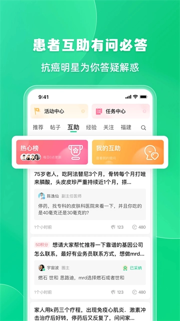 新增互助专区,汇聚病友间的真实互助问答,助力解答康复疑惑,帮助寻找医疗资源。