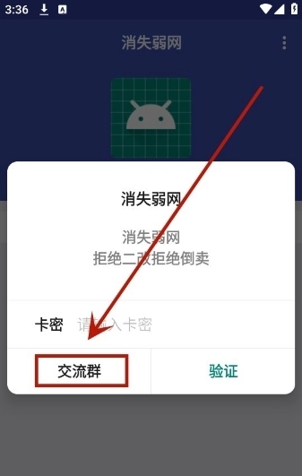 打开消失弱网后,点击【交流群】可以购买卡密。