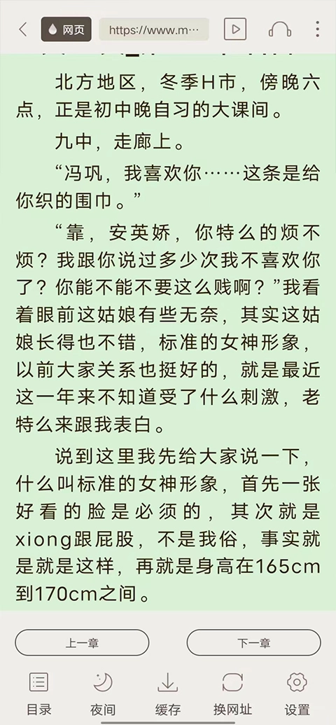 小说阅读界面设有多种菜单选项,包括目录、白天与夜间模式切换、小说本地缓存以及更换网址等功能。
