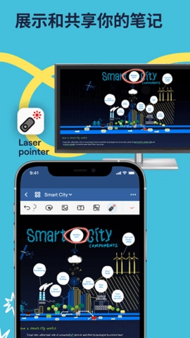分享协作功能:支持导出PDF格式进行分享,允许多人共同协作编辑内容,还能切换至演示模式并使用激光笔工具辅助演示。