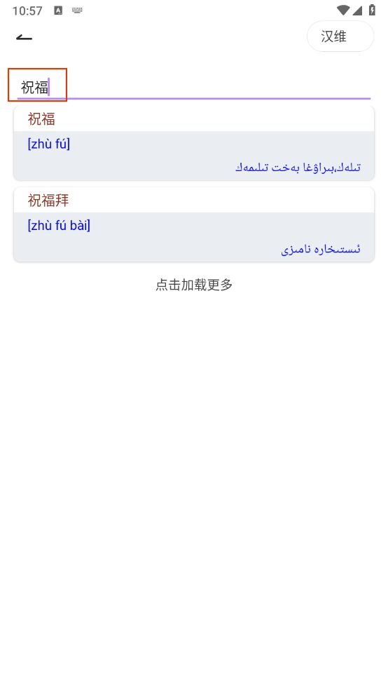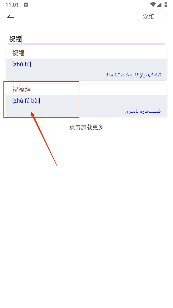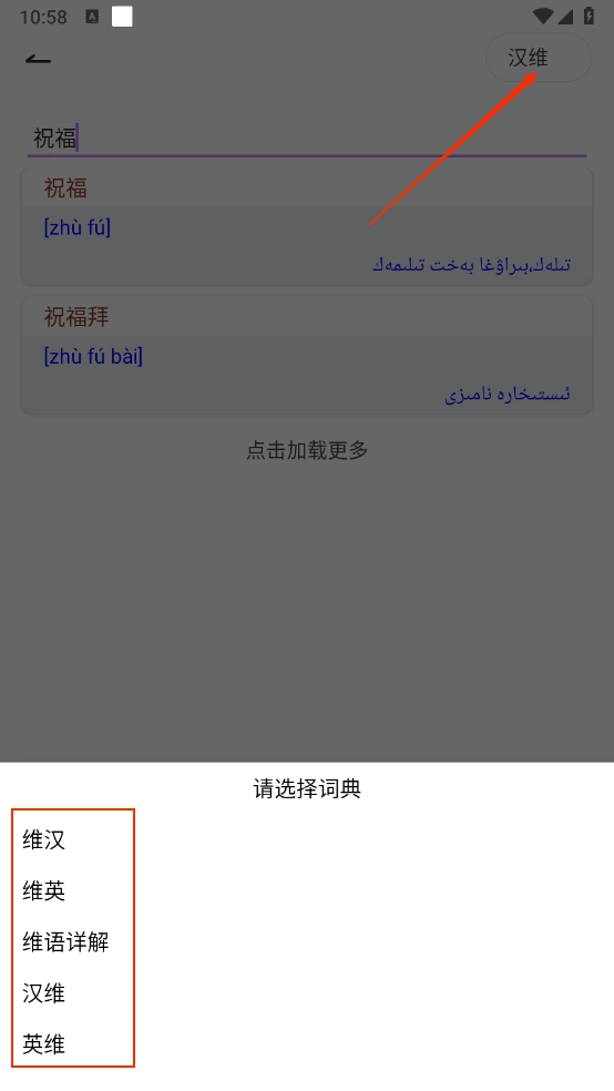 点击右上方的"汉维",可以进行切换相关翻译词典。