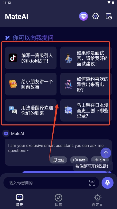 MateAI 了现成的提示词,能助力您轻松应对各类任务。不管您是需要专业建议来解决难题,还是想要获取指导以应对多样挑战,MateAI 都可以为您提供支持。