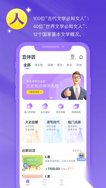 豆伴匠是一款专注于文史学习的软件,它构建了独特的内容体系,把人、文、史、作这四个模块巧妙融合,既全面覆盖文史知识,又深入讲解读写技巧。软件选用鲜活有趣的素材,搭配精彩生动的讲解,让学习过程变得轻松又愉快。不仅如此,它的内容体系也十分丰富,从L0到L12,每个级别都包含了不同时期、不同主题的文史内容——从基础的人物介绍、风俗解析、诗歌赏析,到深入的唐代文学、宋元中外文学专题,再到唐前、明清、现当代等各个阶段的文史知识,全方位满足了不同学习者的需求。