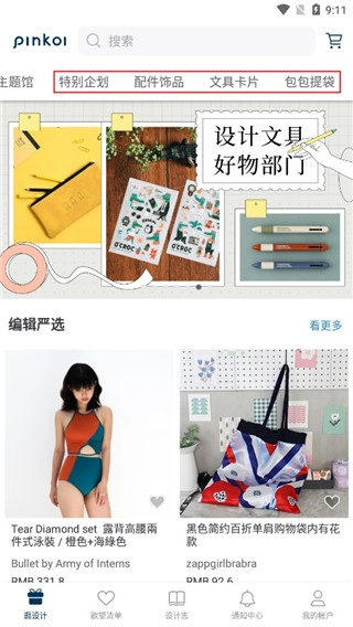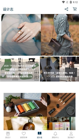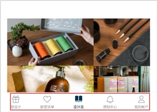 进入软件后,界面分为五大分类:逛设计、欲望清单、设计志、通知中心、我的账号。