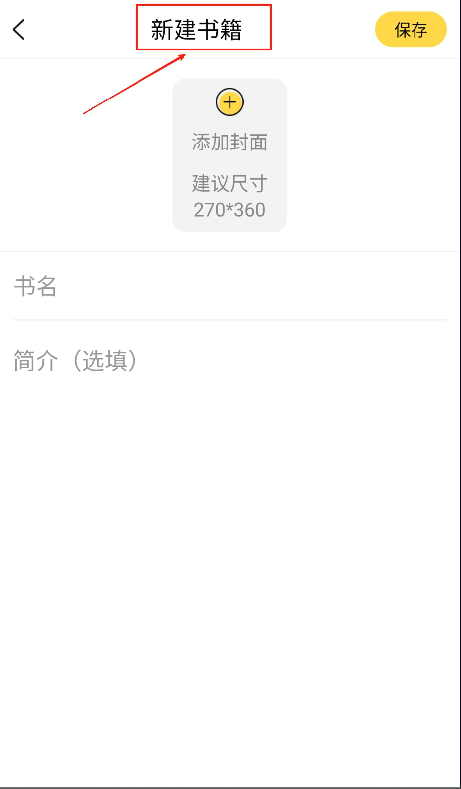 首先要新建一本书籍,接着为其添加封面,然后填写书名和简介,所有步骤完成后,点击页面右上角的保存按钮即可。