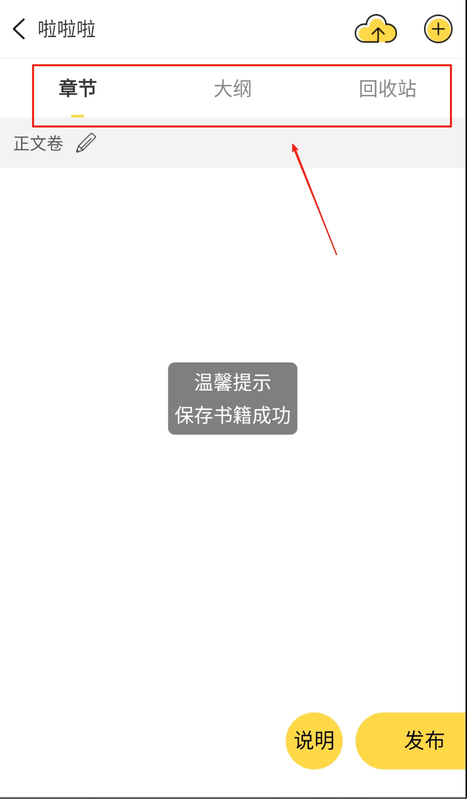 之后就能为小说添加大纲、正文卷和章节了,完成创作后还能进行实时上传云同步。