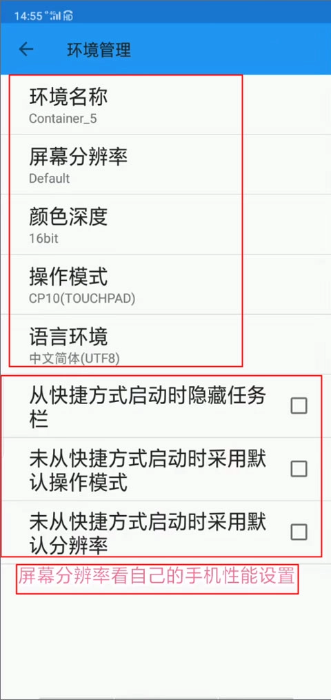 接下来需要对一些参数进行设置,比如屏幕分辨率、颜色深度、操作模式之类的,其中屏幕分辨率可以根据手机自身的性能来调整。