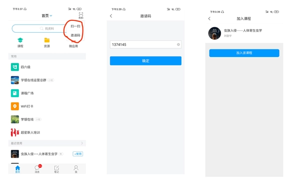 登录完成后,点击页面右上角的小图标,可选择扫描二维码或输入邀请码的方式,然后点击“加入该课程”按钮即可。