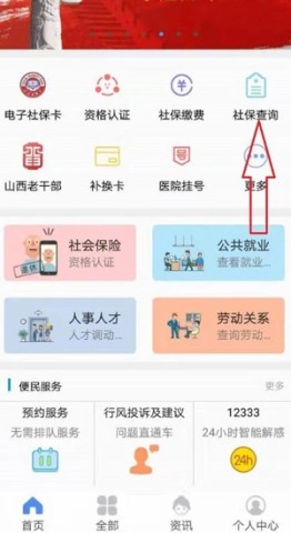 成功注册并登录后,返回主页,点击社保查询;