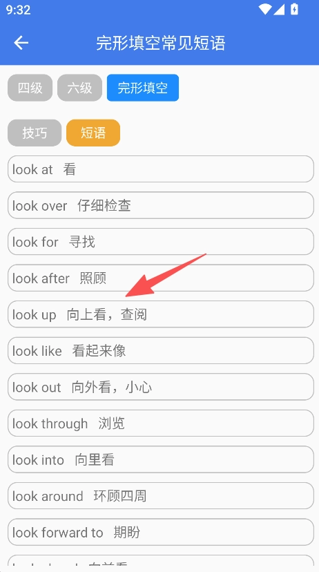 短语列表内容详实,常见短语按类别进行整理,像look相关短语这类就归为一类,便于集中记忆,能让短语积累更高效。