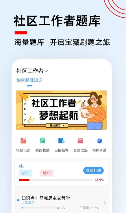 社区工作者题小宝为有志于从事社区工作的求职者打造了一套全面且实用的学习资源体系,助力他们更高效地备战考试,精准把握核心知识点,从而提升考试通过率。这款软件收录了海量模拟习题与历年考试真题,内容覆盖社工考试的所有关键领域。用户可灵活选择章节专项练习、随机抽题测试或全真模拟考试等多种模式,及时检验自身的学习成效。其中的错题回顾功能,能让用户针对知识薄弱点展开针对性强化训练;而实时进度跟踪功能,则可帮助用户清晰掌握学习动态,合理规划备考进程。