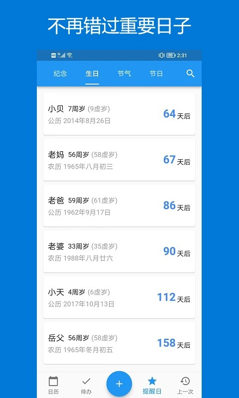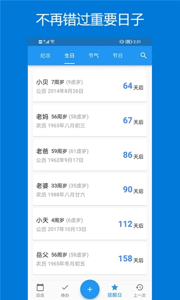 二、时间管理:日程规划、四象限待办清单、纪念日、生日提醒以及“上一次”记录等功能,助力你成为出色的时间管理践行者。
