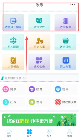 选择“政务服务”栏目,就能获取最新政策动态,让市民及时知晓发布的重要通知。