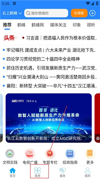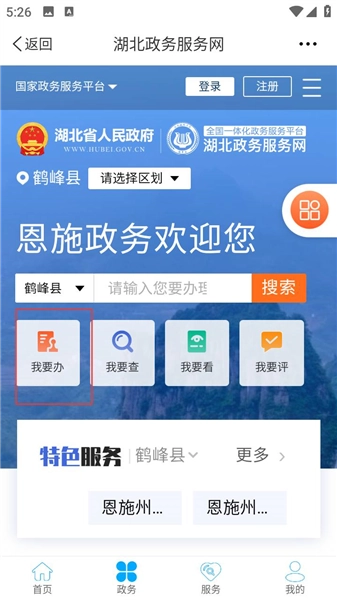打开云上鹤峰应用后,在首页底部找到“政务”按钮并点击,就能进入政务板块。该板块整合了各类政务服务的入口,能让用户更便捷地办理各类政务事项。