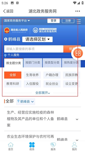 进入湖北政务服务网后,首先要选择具体的区划,比如鹤峰县。之后,既可以借助搜索框输入相关事项来查找,也能够在个人服务板块里,按照主题、部门等不同分类方式进行检索,这样就能便捷、快速地找到自己需要的政务服务了。