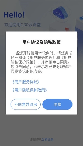 在手机上安装C30云课堂应用,仔细阅读用户协议内容后点击同意按钮。
