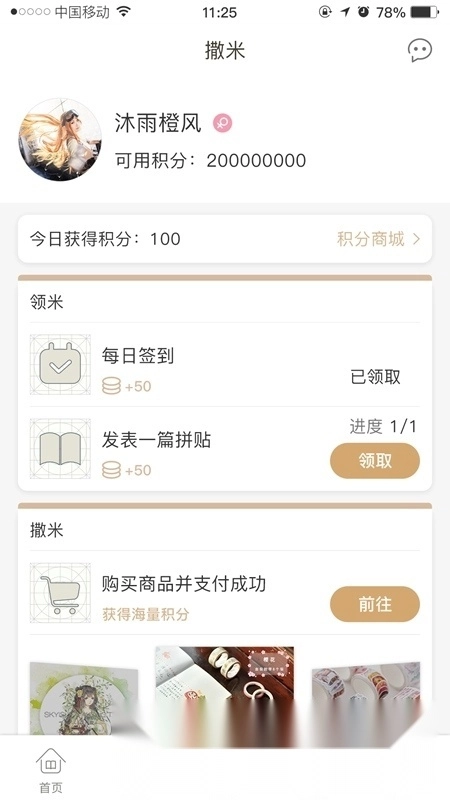 撒米提供全面的手账集市动态,可实时追踪;开团信息不断更新,独特的拼团模式能满足个性化需求;每日都能获得积分,并且有大量米券和福利定期发放。