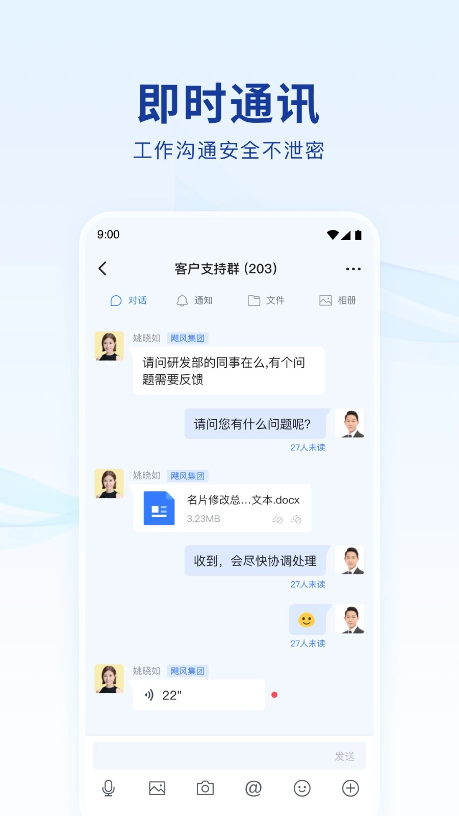 即时通讯功能:可支持文字、语音、视频等各类沟通形式,有助于员工之间开展即时性的交流互动。