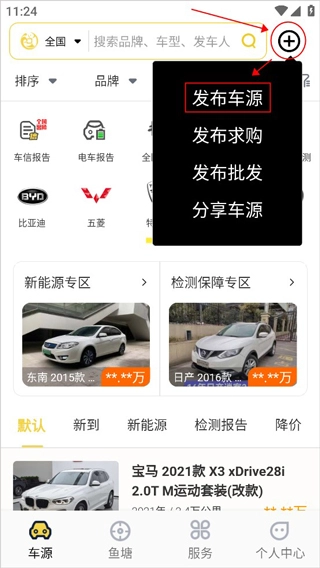 在金鱼塘的主页面,点击右上角的“+”按钮,弹出选框后,点击“发布车源”选项。