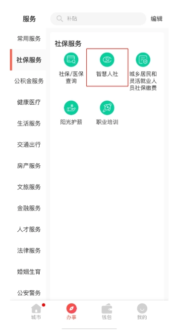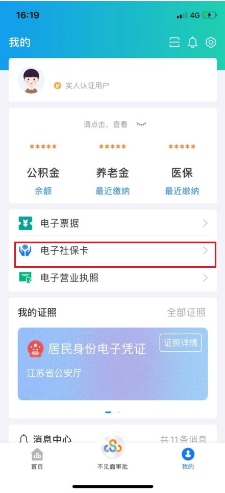 进入“我的南京”后,依次点击“办事”“社保服务”“智慧人社”以及“电子社保卡”。
