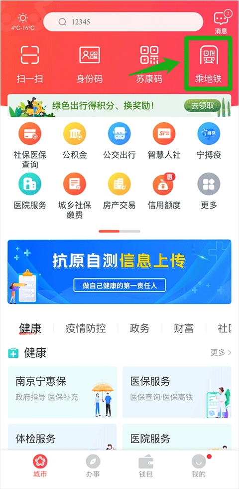 首先打开“我的南京”应用,在首页找到“乘地铁”按钮,点击该按钮进入相关页面。