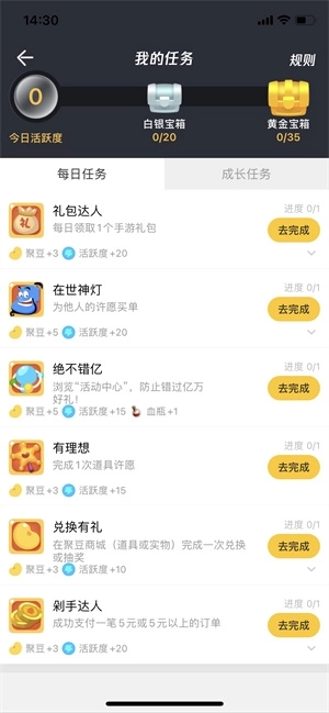 2、在完成每日任务/成长任务可获得聚豆,每日活跃度达到20和35,可开启白银宝箱和黄金宝箱,聚豆暴击!
