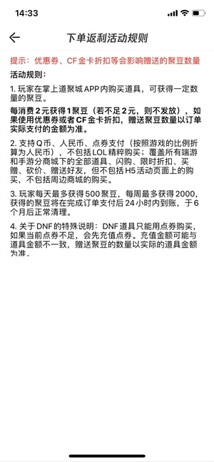 3、下单可获得聚豆返利。每消费2元可获得1聚豆(若不足2元,则不发放),赠送聚豆数量以订单实际支付的金额为准,支持Q币、人民币、点券支付。