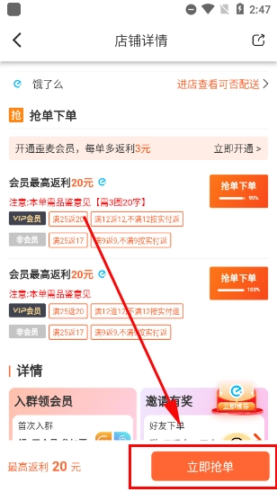 选好你想品尝的美食后,点击下方的抢单按钮就能参与活动啦,要是加入会员的话,还能享受到更高的返利优惠呢