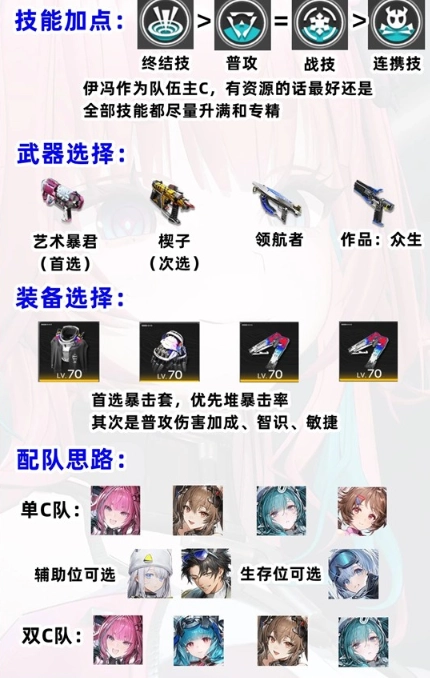 ,伊冯最主要的输出方式就是终结技,其次是普攻和战技;当然作为队伍主C,有资源的话推荐全部技能都尽量升满和专精。