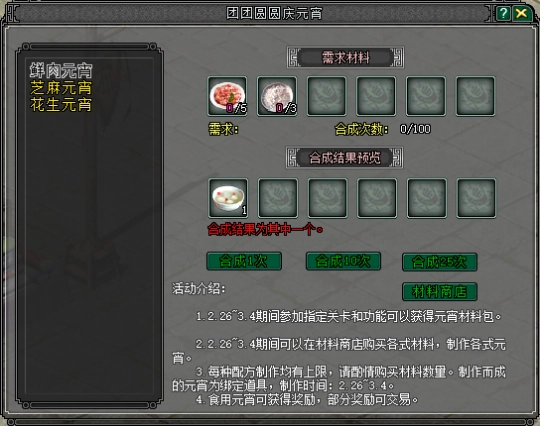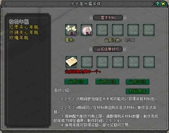 大侠通关指定副本、完成日常任务可额外获得 “年糕材料包”,在活动大使处领取制作手册,根据配方可制作四种年糕,食用可获经验、脉气等奖励,制作出越优质的年糕,开出的珍稀道具越丰厚。