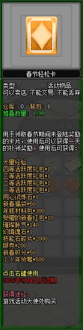 2 月 24 日至 3 月 4 日,春节期间(2 月 15 日 - 2 月 23 日)未登录的大侠,可按未登录天数购买 “春节轻松卡”,使用后可补领活跃度礼包、新春福袋、年糕材料包等丰厚奖励,轻松跟上活动节奏。奖励不错过,安心过好年。