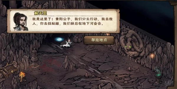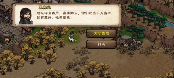 2、向黑先生(1,6)打听「碧游教动向」,酉时在(12,11)触发剧情,然后在(13,11)触发剧情选择「闪躲」,剧情后来到【隐秘据点】。