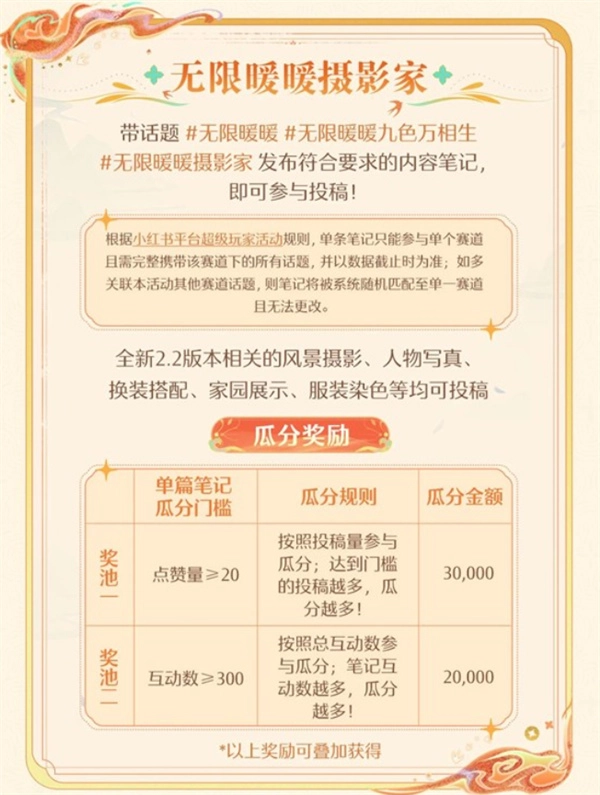 2、无限暖暖摄影家:发布带有 #无限暖暖九色万相生 #无限暖暖摄影家 标签的笔记,即可参与赛道瓜分及评选。