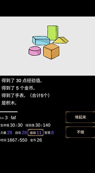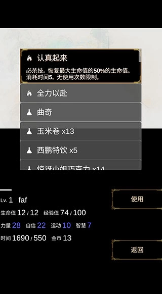 左下角显示着自身的等级、生命值、剩余时间、金币数量以及经验值等信息,途中会触发各类随机事件,你可以自行选择发起战斗或是转身逃跑。