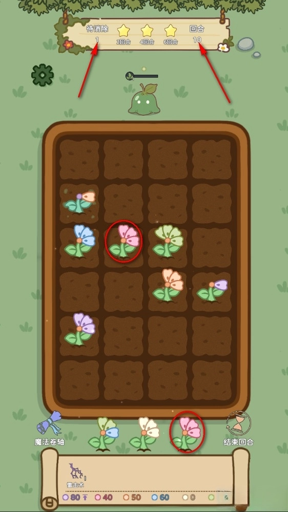 开始游戏后,把预备区里的花拖到空地上,相同颜色的花会自动合成,屏幕上方会显示本关的目标要求。