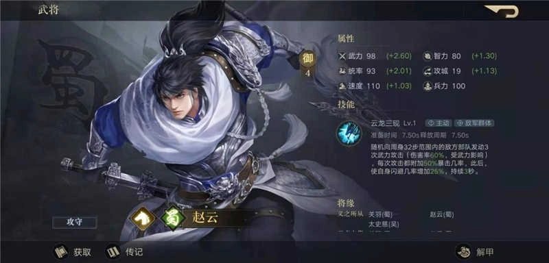 赵云装备推荐:洛神赋、涯角枪,备选雕翎冠、梨花枪,加点全武力。