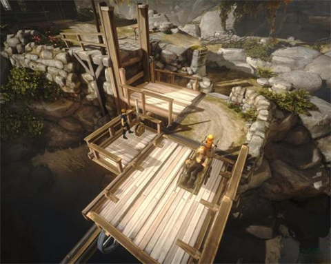 游戏开始后,顺着路朝桥的方向行进,会遇到一个简单的解谜环节。此时弟弟力气不足,得让哥哥来扳动把手。过桥后往右侧走,来到一处断裂的梯子下方,需要哥哥将弟弟托举上去,弟弟再把旁边的绳子放下,让哥哥也能上来,之后两人一同去扳动升降机旁的把手。