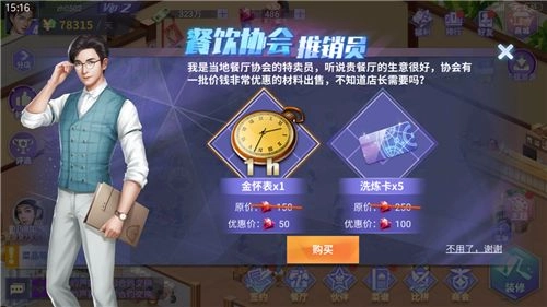 餐厅偶尔会有餐饮协会的工作人员上门推销,先别急着拒绝哦~虽然推销人员的颜值确实让人忍不住想听他介绍(开玩笑的啦),但他们推销的稀有礼品(适合送给合伙人)和升级道具,性价比其实挺高的。要是你真的不需要,婉言谢绝就好啦。