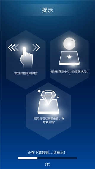 按住并拖动来操控,让球落入中心以调整砖块大小,收集钻石可解锁曲目、弹球与主题。