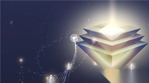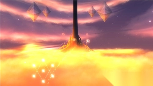 第二关宛如天庭,坐落于森林上空的一片祥云之上。起初我以为和第一关一样,结果冲到顶端后撞到上层云层,触发了雷电。这片区域中央有棵参天大树,树的周围有几个符号的虚影。以这棵树为中心,空间里悬浮着几处由棱柱堆成的石堆,棱柱上有几个圆点,只需操控小球靠近,点亮棱柱上所有的圆点就行。每点亮一处棱柱,树周围的一个符号就会被点亮,我记得总共有六个符号,全部点亮后就能通关。