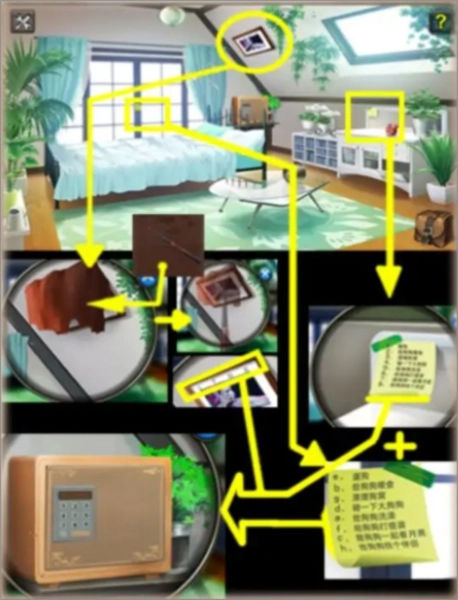 点击窗帘旁的红色布片,接着从道具栏取出刚得到的鱼竿使用,把布片掀开,让后面的画作显现出来。请务必记住画上的4个字母。点击床旁窗户上的黄色标签,标签上有字母和内容的对应规则。依据这个规则,解读出画上4个字母对应的意思。去到主场景右侧的黄色便签处,便签内容和上一步解读出的意思紧密相关。通过这些信息,推理得出密码箱需要的最终数字。