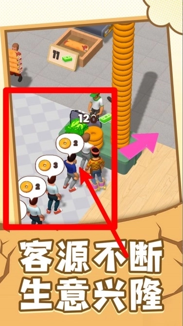 顾客排队进行点单,其头顶会显示带有需求数量的食材图标;在此过程中,需优先处理高价订单,以此维持订单处理的流速,进而提升店铺口碑并增加小费收益。