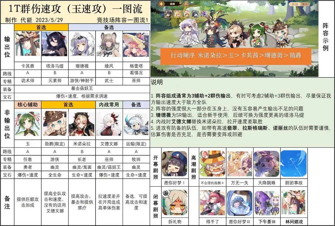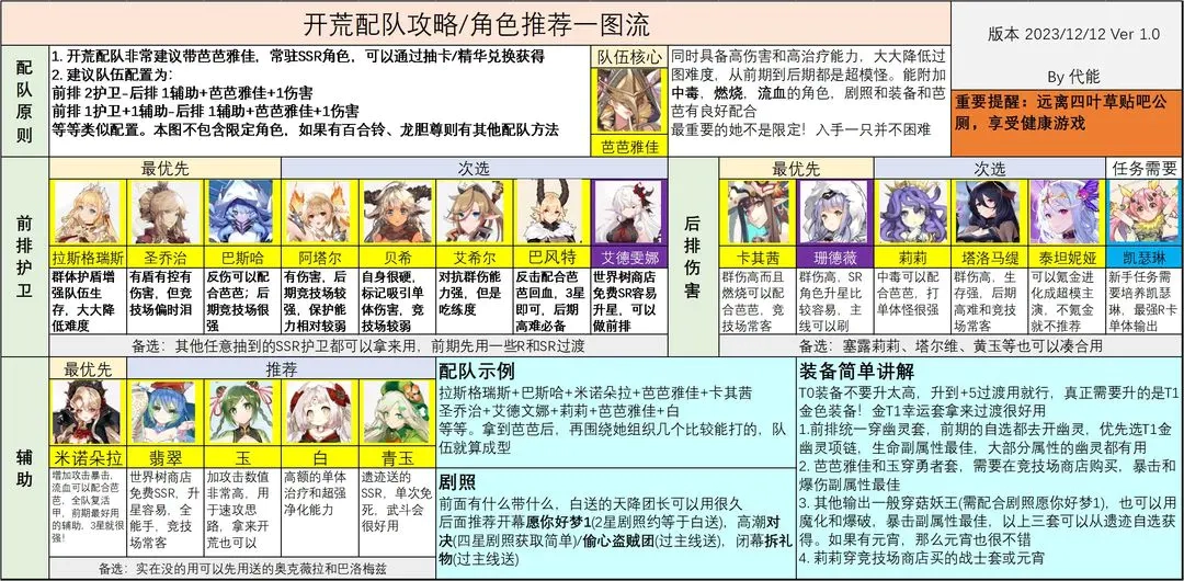 以芭芭雅佳为核心的开荒队伍配置如图所示。新手阶段抽卡及连斩角色的选择可参考这张图。这套阵容适用于推图、挑战世界树、参与武斗会、竞技场,乃至公会战等多种玩法场景。