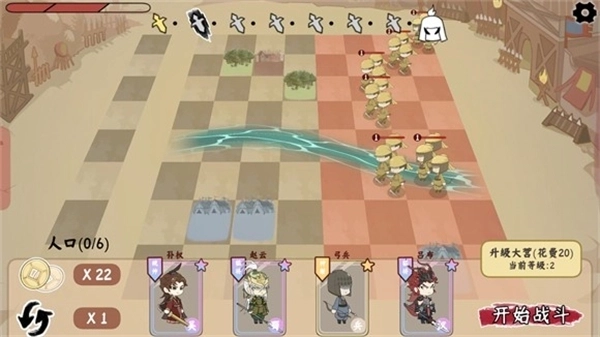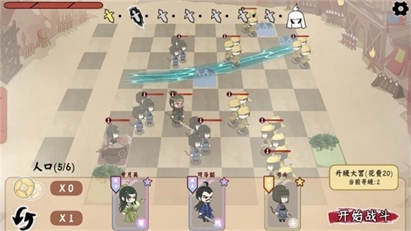 把小兵放置到棋盘上后,点击“开始战斗”按钮就能开启闯关;棋子会自行攻击敌人,等所有敌人都被击败,即可顺利通关。