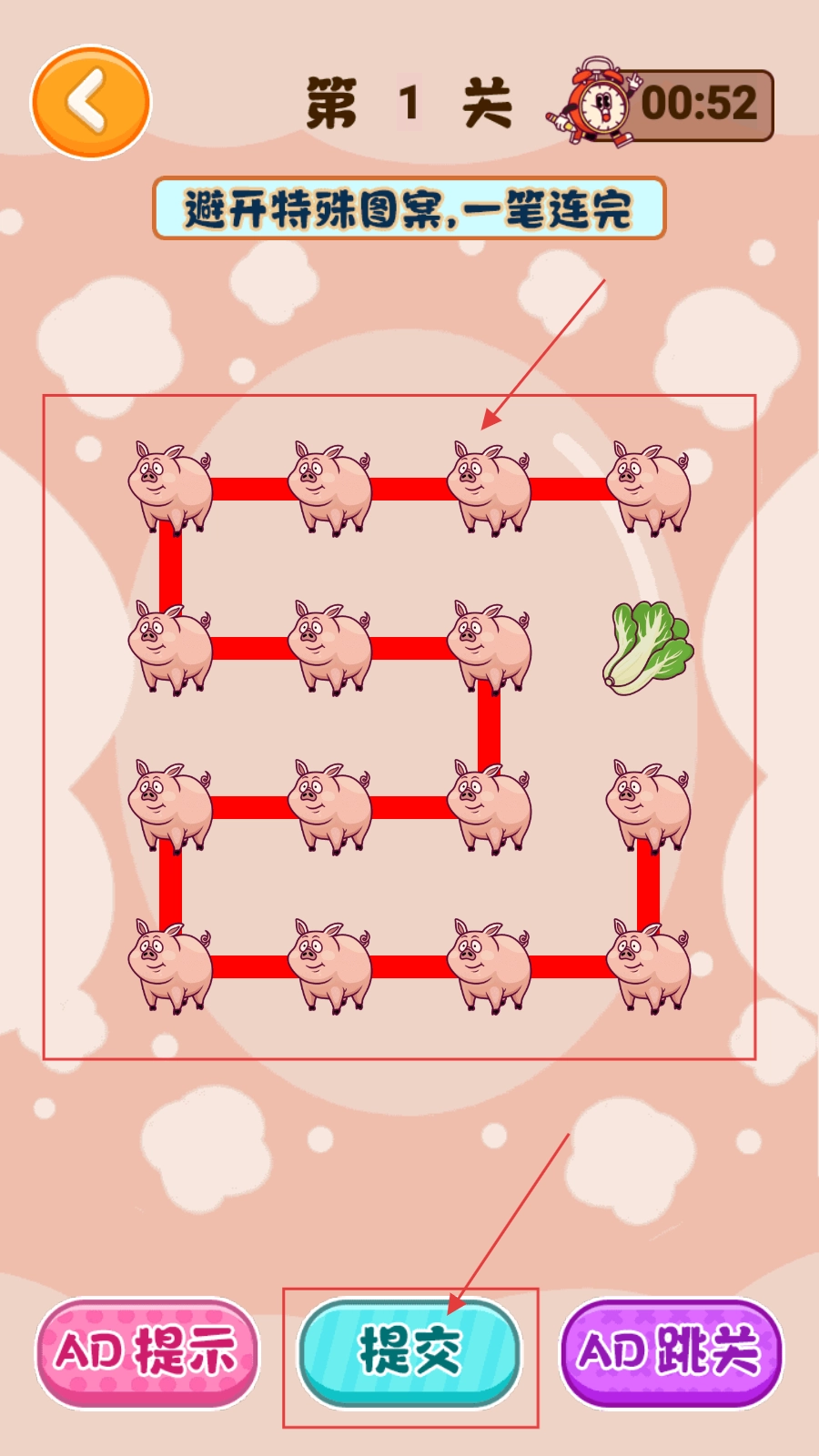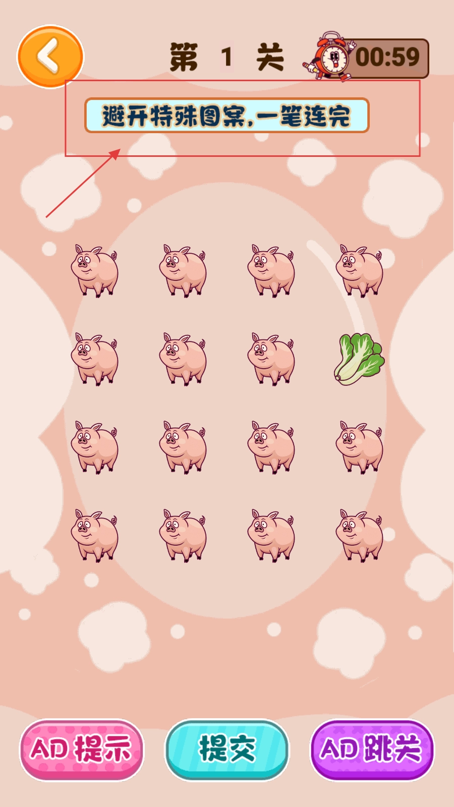 第1关需遵循规则,避开特殊图案(白菜),规划合适路径将小猪全部连接起来。